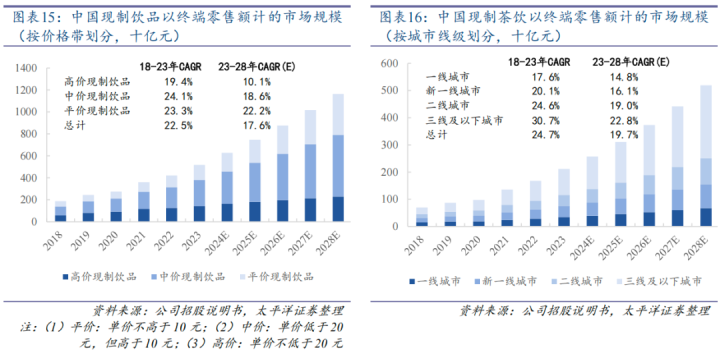 据灼识咨询预测,2023年-2028年三线及以下城市现制茶饮市场的复合年增长率(CAGR)将达到22.8%,明显高于一线、新一线和二线城市(分别为14.8%、16.1%和19.0%)。目前,三四线城市的茶饮门店密度约为0.8家/万人,远低于一线城市的2.5家/万人,未来具备较大增长潜力。